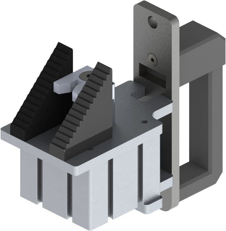 Zweiteiliger Schweißeckverbinder, bestehend aus Grundkörper und Spannelement "Zunge".